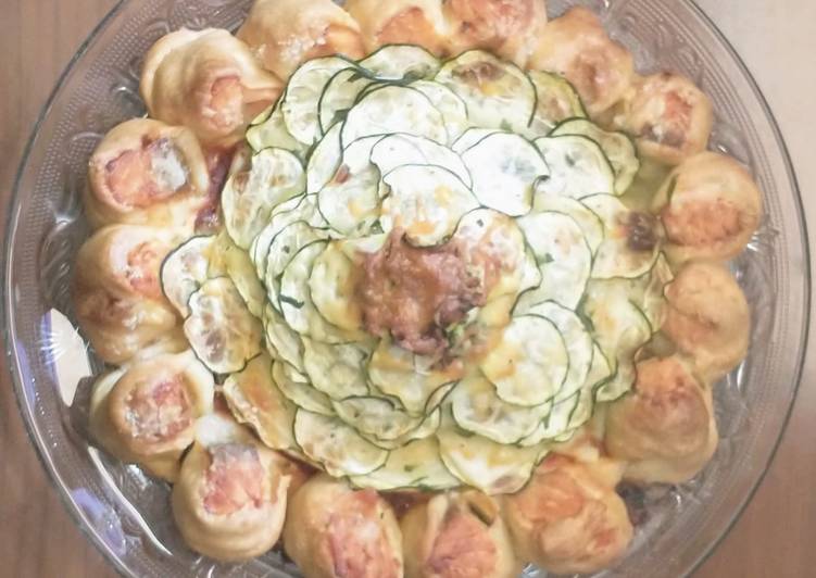 - Abrimos aplastando un poco el ramo de los calabacines enrollados para dejarlo en forma de flor, rociamos el queso rallado por el centro de la flor y metemos en el horno a 180º durante 25 minutos y listo nuestro pastel..