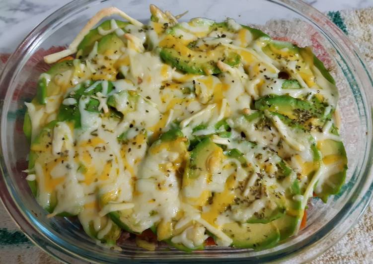 - Ponemos una sartén al fuego con unas gotas de aceite de oliva y cuando esté caliente ponemos los trozos de calabaza y los cocinamos por los 2 lados. Según se hagan montamos una capa de calabaza encima de la carne y encima de esta una capa con el aguacate. Encima de este queso y orégano..