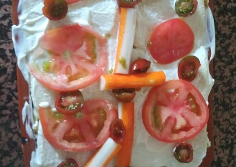 - Una vez pasen las dos horas lo decoramos como queramos, yo le he puesto tómate ensalada a rodajas, cherry, palitos de mar. Pero también puedes ponerle aguacate ponerle un poco más de ensalada etc....