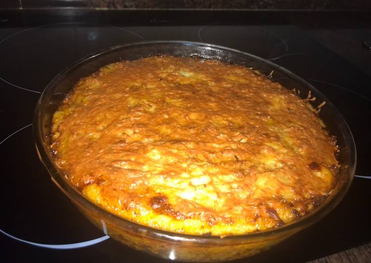 - Encima del puré de patatas, ponemos queso rallado al gusto y metemos el pyrex de cristal al horno durante unos 45 min aproximadamente o hasta que veamos que el queso se empieza a tostar.