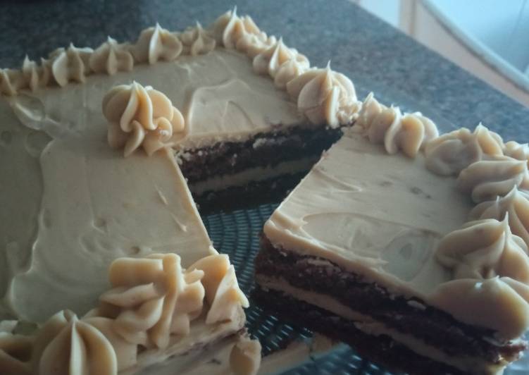 - Con un príncep bañamos los lados interiores del bizcocho con el sirope de café.sobre el primer disco extendemos la mitad de la crema de café, tapamos con el Segundo y cubrimos todo el bizcocho..