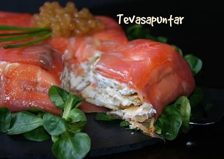 - Hacemos una cama de canónigos y ponemos nuestro pastel encima, adornamos con el caviar y unas tiras de cebollino, es todo un espectáculo de color y ni os cuento de sabor, servir acompañado de canónigos y un poco de caviar y una buena copa de vino blanco fresquito y a disfrutar. Tevasapuntar..