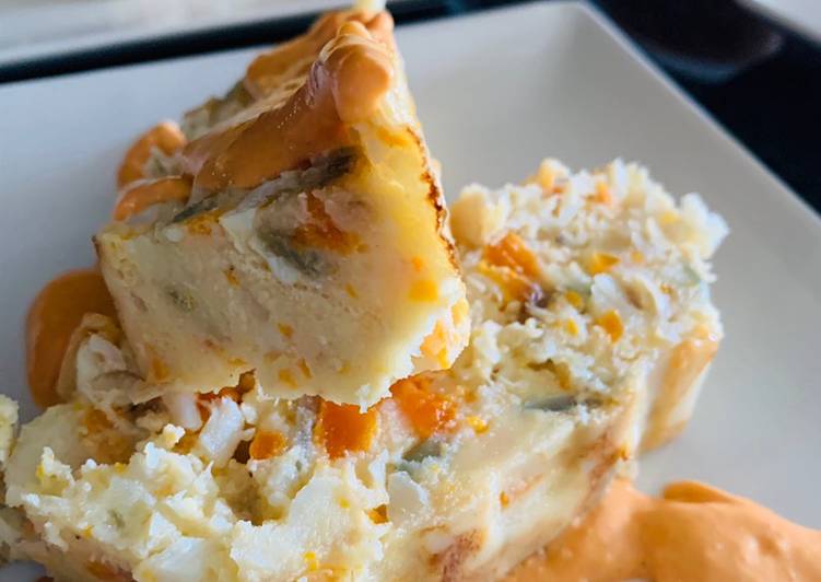 Pastel semifrio de patata y bacalao, con crema suave de tomate instructions